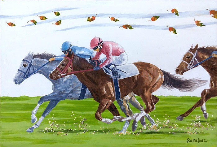 抜かれ抜きつつゴールに向かう騎手と馬。